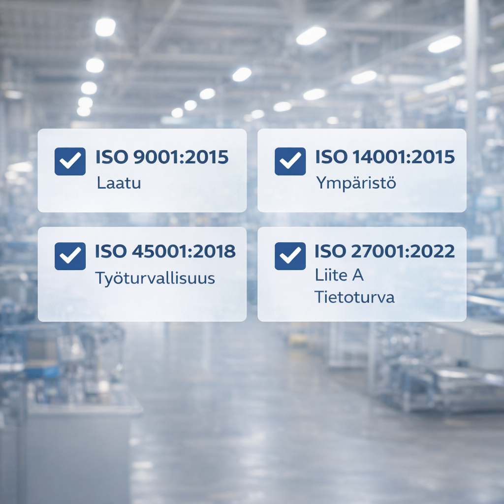 Toimintaamme ohjaa ISO9001:2015, ISO14001:2015 ja ISO45001:2018 mukainen johtamisjärjestelmä varmistaen korkeimman laadun, ympäristötietoisuuden ja työturvallisuuden. Noudatamme toiminnassamme myös ISO27001:2022 Liitteen A kontrolleja soveltuvin osin.